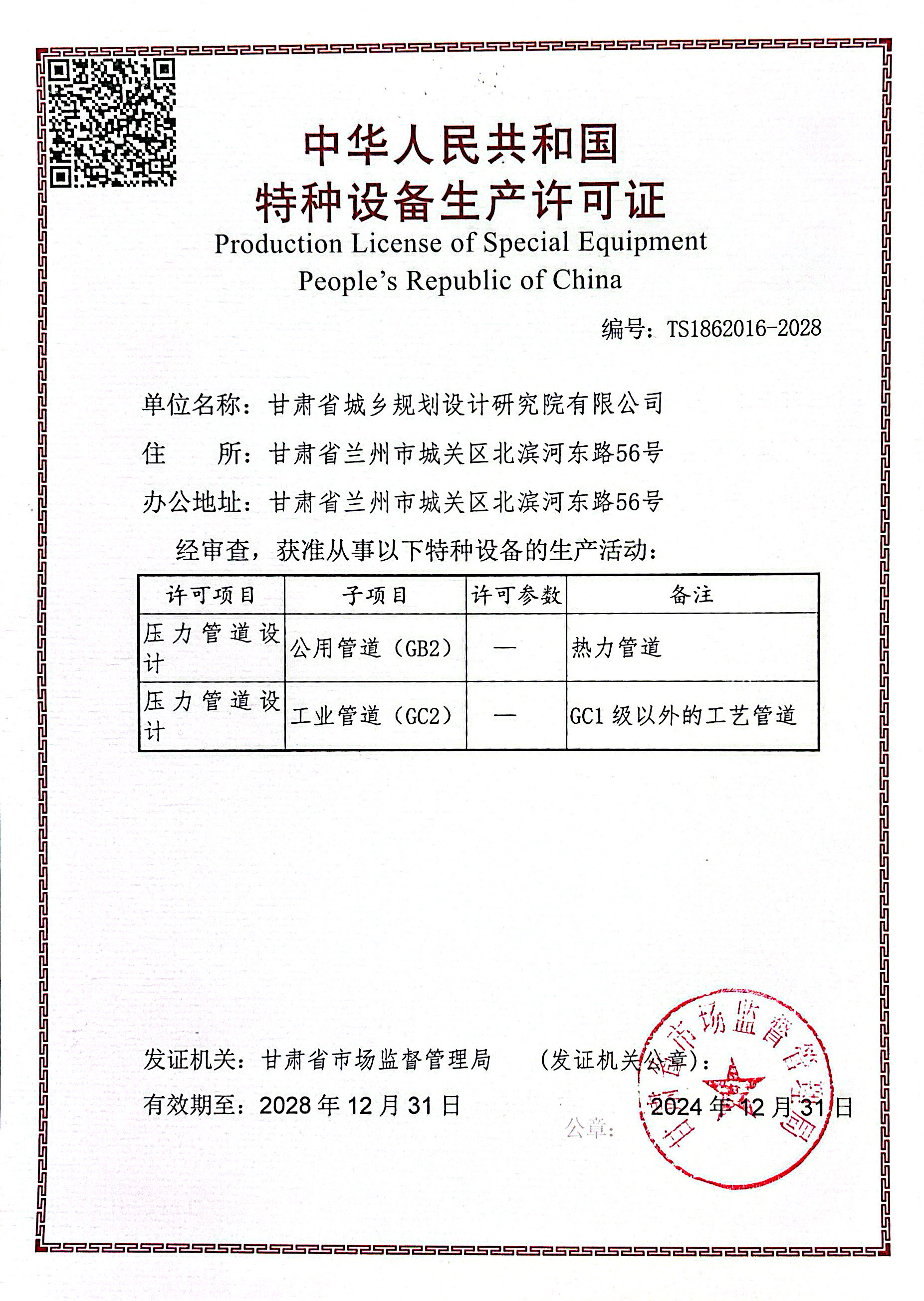 中华人民共和国特种设备生产许可证