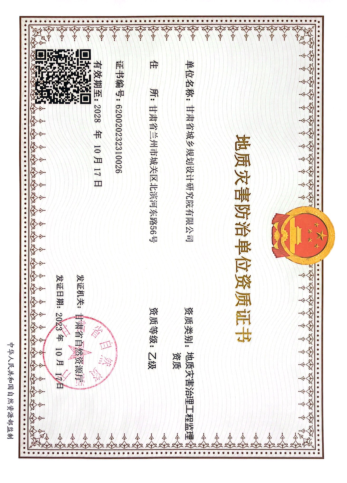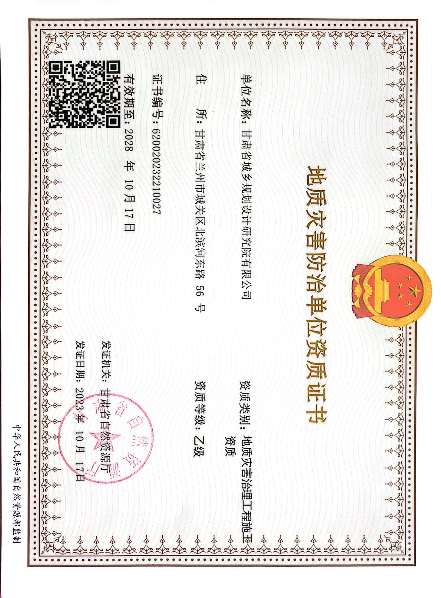 地质灾害防治单位资质证书
