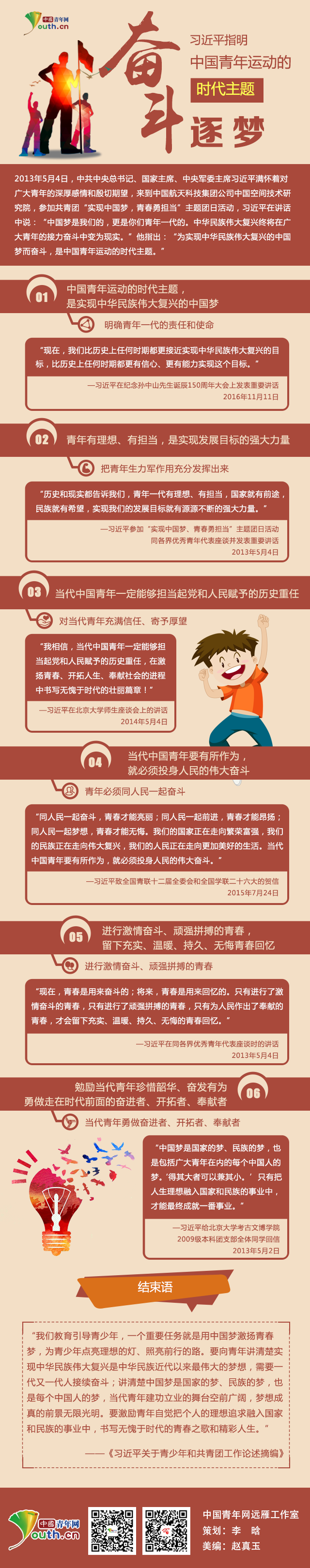 中国青年网北京9月23日电(记者 李晗) 习近平同志强调:实现中华民族伟大复兴的中国梦,是党和国家工作大局,也是中国青年运动的时代主题。同人民一道拼搏、同祖国一道前进,服务人民、奉献祖国,是当代中国青年的正确方向。实现中华民族伟大复兴是中华民族近代以来最伟大的梦想,需要一代又一代人接续奋斗;中国梦是国家的梦、民族的梦,也是每个中国人的梦,当代青年建功立业的舞台空前广阔,梦想成真的前景无限光明。青年要自觉把个人的理想追求融入国家和民族的事业中,书写无愧于时代的青春之歌和精彩人生。