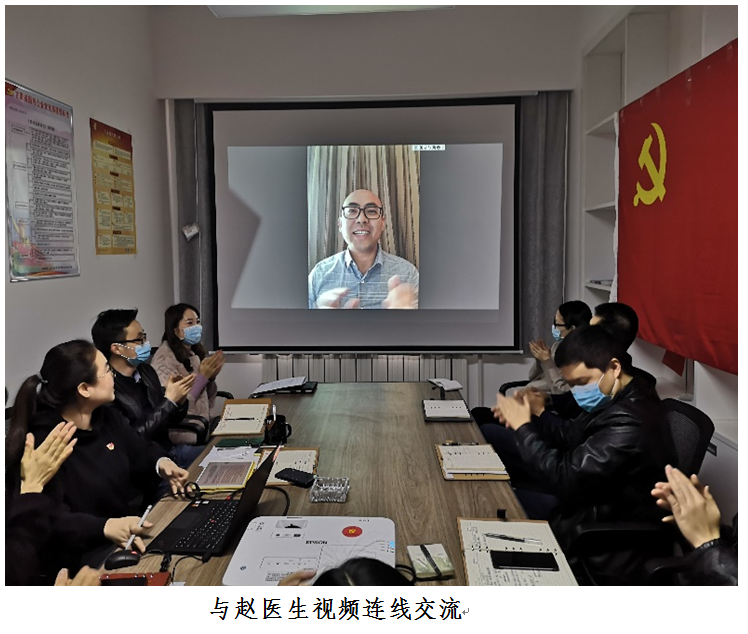 本次主题党日活动还特别邀请到赴湖北武汉抗疫一线的赵振峰医生(青海省心脑血管病专科医院呼吸与危重症学科主治医师),通过视频连线为全体参会人员上了一堂特殊又极富意义的党课。据赵医生介绍,他在2月7日接到青海红十字会支援湖北的召集令后闻令而动,不到三个小时就奔赴武汉,成为华中科技大学附属医院救护转运队中的一员,负责重症和危重症患者的转运工作。由于转运病患病情较重且行动不便,转运工作极其辛苦且感染风险较大,他和他的同事不敢懈怠,小心细致的关注着工作的每个环节;在问到赵医生面对疫情感染的风险,临行出征前有没有畏惧时,赵医生激动的说道:“共产党员应是冲锋陷阵的骨干力量,挺身而出既是一名医务工作者的职责所在,也是一名党员的使命职责,我义不容辞”;赵医生在讲述完武汉抗疫工作的各种所见所感后,从专业角度出发,为所有参会人员提供了9条防疫防护措施及建议,同时鼓励大家一定要坚定信念,继续关注个人卫生防护。在连线即将结束之际,全体人员起立为赵医生鼓掌致敬,以此向他和他的同事们致以最崇高的敬意。