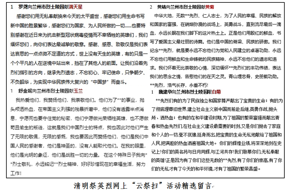 “青山有幸埋忠骨,烈士墓前抚英魂”。在清明节即将到来之际,鉴于疫情防控工作要求,第五党支部组织开展全体党员清明祭英烈网上“云祭扫”活动,深刻缅怀那些为新中国洒热血,对共产党忠贞不渝的志士先烈,同时也向近期在抗击新型冠状病毒疫情中不幸牺牲的英雄们致敬。所有党员同志纷纷积极响应,在兰州市烈士陵园官网为烈士献花留言,表达自己的崇敬之心,感激之情和传承之志。